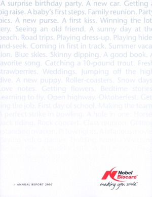 Annual Report Highlights: View Competition Class Performance | Company/Agency Name: | Nobel Biocare Holding AG    / Kirchhoff Consult AG | | Company/Agency Web Site: | www.nobelbiocare.com / www.kirchhoff.de | | Company Ticker Symbol: | NOB | | Annual Revenue: | $100 million - $1 billion | | Employee Base: | 1,000 - 10,000 Employees | | Core Industry: | Health Care -- Providers & Services | | Award Garnered: | Gold | | Top 100 Rank: | 76 | | | | Judging Results | | First Impression: | | | Report Cover: | | | Letter to Shareholders: | | | Report Narrative: | | | Report Financials: | | | Creativity: | | | Message Clarity: | | | Information Accessibility: | | | Total Score: | |
