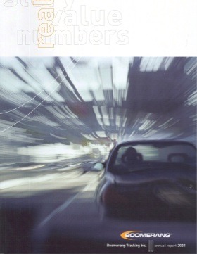 Download This Year's Entry FormPublication Highlights: | Company Name: | Boomerang Tracking | | Employee Base: | Up to 1,000 | | Annual Revenue: | Up to $100 Million | | Sector/Industry: | Technology - Instruments, Equipment, and Communications Services | | | | | Judging Results: | | | First Impression: | | | Report Cover: | | | Letter to Shareholders: | | | Report Narrative: | | | Report Financials: | | | Artwork: | | | Readability: | | | Creativity: | | | Clarity: | | | Info Accessibility: | | | Total Score: | |