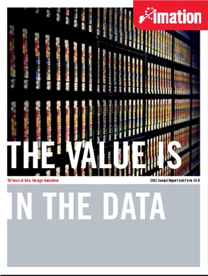 Download This Year's Entry FormAnnual Report Highlights: | Company Name: | Imation | | Company Web Site: | www.imation.com | | Ticker Symbol: | IMN | | Employee Base: | 1,000 - 10,000 Employees | | Annual Revenue: | $1+ Billion | | Core Industry: | Technology | | Award Garnered: | Silver | | | | Judging Results | | First Impression: | | | Report Cover: | | | Letter to Shareholders: | | | Report Narrative: | | | Report Financials: | | | Creativity: | | | Message Clarity: | | | Information Accessibility: | | | Total Score: | |