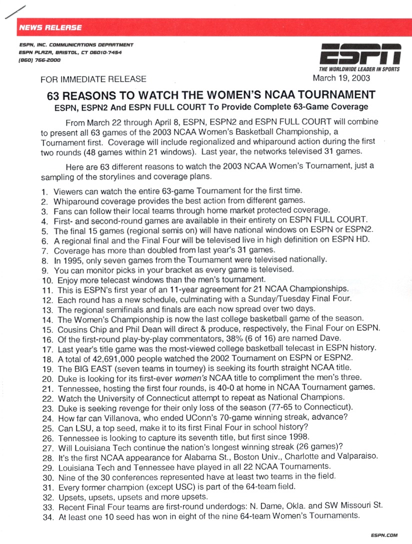 NCAA Women's Basketball Tournament Press Release: 63 Reasons to Watch |