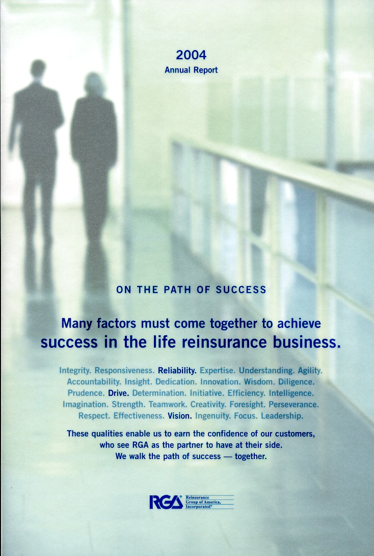 Download This Year's Entry FormAnnual Report Highlights: View Competition Class Performance | Company Name: | Reinsurance Group of America, Inc.  | | Company Web Site: | www.rgare.com | | Company Ticker Symbol: | RGA | | Annual Revenue: | $1+ Billion | | Employee Base: | 100 - 1,000 Employees | | Core Industry: | Insurance & Related | | Award Garnered: | Platinum | | Top 100 Rank: | 31 | | | | Judging Results | | First Impression: | | | Report Cover: | | | Letter to Shareholders: | | | Report Narrative: | | | Report Financials: | | | Creativity: | | | Message Clarity: | | | Information Accessibility: | | | Total Score: | |