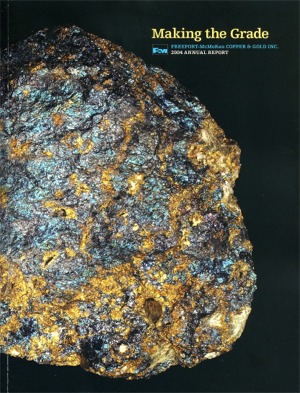 Download This Year's Entry FormAnnual Report Highlights: View Competition Class Performance | Company/Agency Name: | Freeport-McMoRan Copper & Gold Inc.  / Eisenberg and Associates | | Company/Agency Web Site: | www.fcx.com / www.eisenberg-inc.com | | Company Ticker Symbol: | FCX | | Annual Revenue: | $1+ Billion | | Employee Base: | 10,000+ Employees | | Core Industry: | Materials / Natural Resources / Mining | | Award Garnered: | Honors | | | | Judging Results | | First Impression: | | | Report Cover: | | | Letter to Shareholders: | | | Report Narrative: | | | Report Financials: | | | Creativity: | | | Message Clarity: | | | Information Accessibility: | | | Total Score: | |