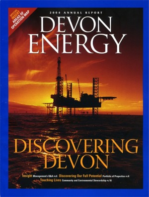Download This Year's Entry FormAnnual Report Highlights: View Competition Class Performance | Company Name: | Devon Energy Corporation  | | Company Web Site: | www.dvn.com | | Company Ticker Symbol: | DVN | | Annual Revenue: | $1+ Billion | | Employee Base: | 1,000 - 10,000 Employees | | Core Industry: | Energy/Utilities - Oil & Gas | | Award Garnered: | Gold | | Top 100 Rank: | 15 | | | | Judging Results | | First Impression: | | | Report Cover: | | | Letter to Shareholders: | | | Report Narrative: | | | Report Financials: | | | Creativity: | | | Message Clarity: | | | Information Accessibility: | | | Total Score: | |