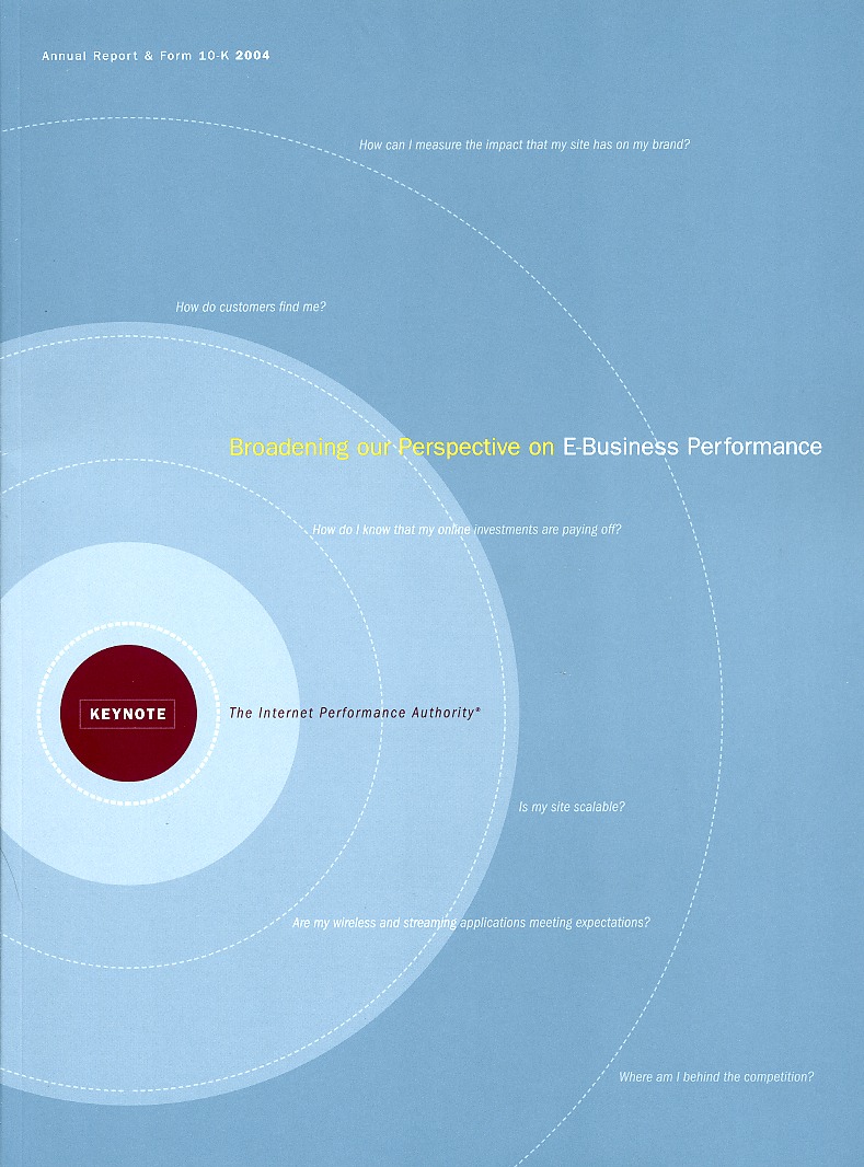 Download This Year's Entry FormAnnual Report Highlights: View Competition Class Performance | Company Name: | Keynote Systems  | | Company Web Site: | www.keynote.com | | Company Ticker Symbol: | KEYN | | Annual Revenue: | $10 Million - $100 Million | | Employee Base: | 100 - 1,000 Employees | | Core Industry: | Technology | | Award Garnered: | Bronze | | | | Judging Results | | First Impression: | | | Report Cover: | | | Letter to Shareholders: | | | Report Narrative: | | | Report Financials: | | | Creativity: | | | Message Clarity: | | | Information Accessibility: | | | Total Score: | |
