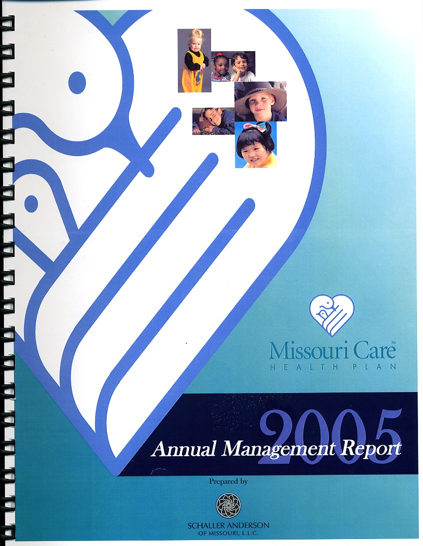 Download This Year's Entry FormAnnual Report Highlights: View Competition Class Performance | Company Name: | MissouriCare Health Plan  | | Company Web Site: | www.missouricare.com | | Annual Revenue: | $10 Million - $100 Million | | Employee Base: | Up to 100 Employees | | Core Industry: | Non-Profit | | Award Garnered: | Honors | | | | Judging Results | | First Impression: | | | Report Cover: | | | Letter to Shareholders: | | | Report Narrative: | | | Report Financials: | | | Creativity: | | | Message Clarity: | | | Information Accessibility: | | | Total Score: | |