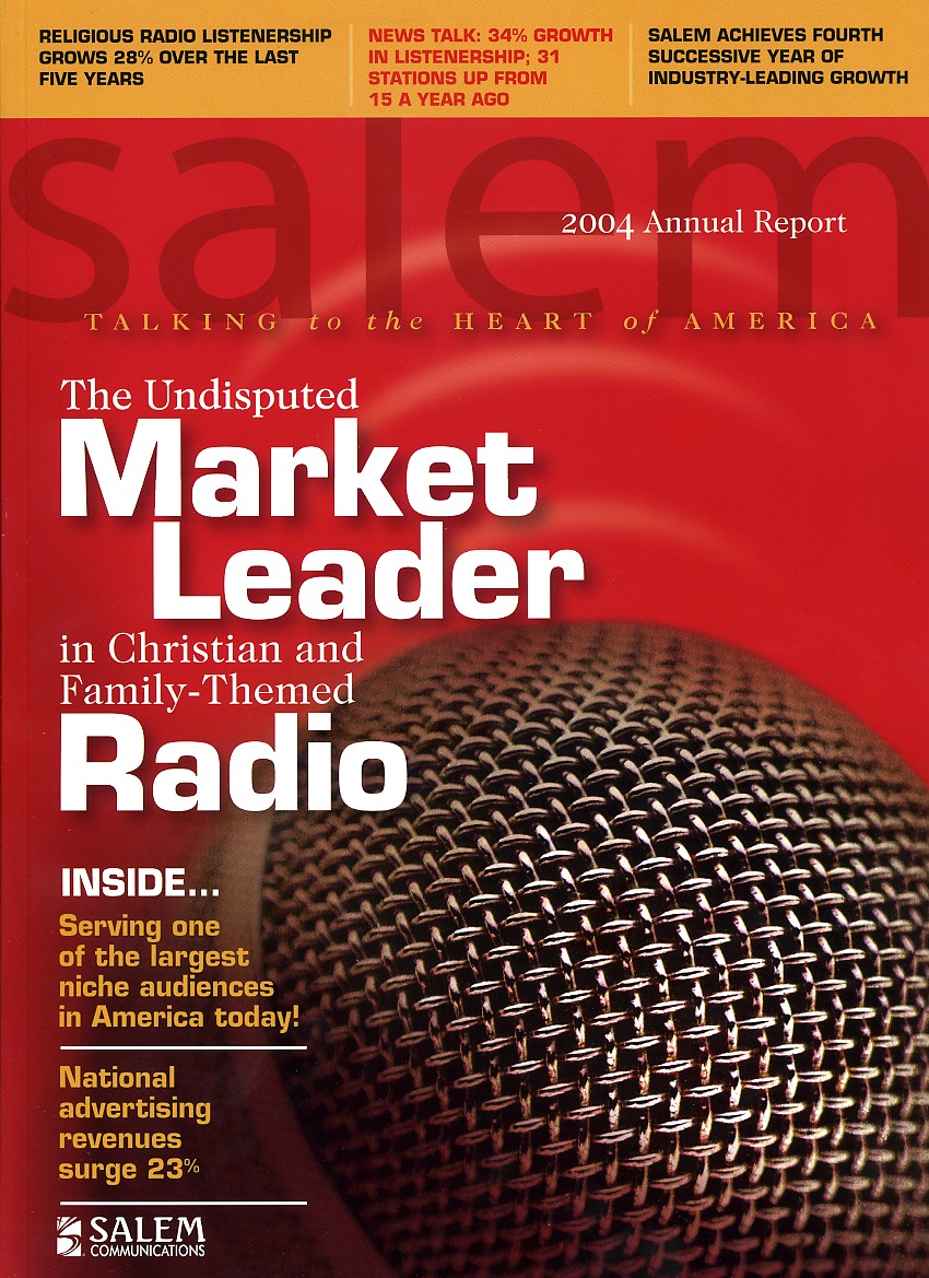 Download This Year's Entry FormAnnual Report Highlights: View Competition Class Performance | Company Name: | Salem Communications  | | Company Web Site: | www.salem.cc | | Annual Revenue: | $100 Million - $1 Billion | | Employee Base: | 1,000 - 10,000 Employees | | Core Industry: | Media / Communications | | Award Garnered: | Bronze | | | | Judging Results | | First Impression: | | | Report Cover: | | | Letter to Shareholders: | | | Report Narrative: | | | Report Financials: | | | Creativity: | | | Message Clarity: | | | Information Accessibility: | | | Total Score: | |