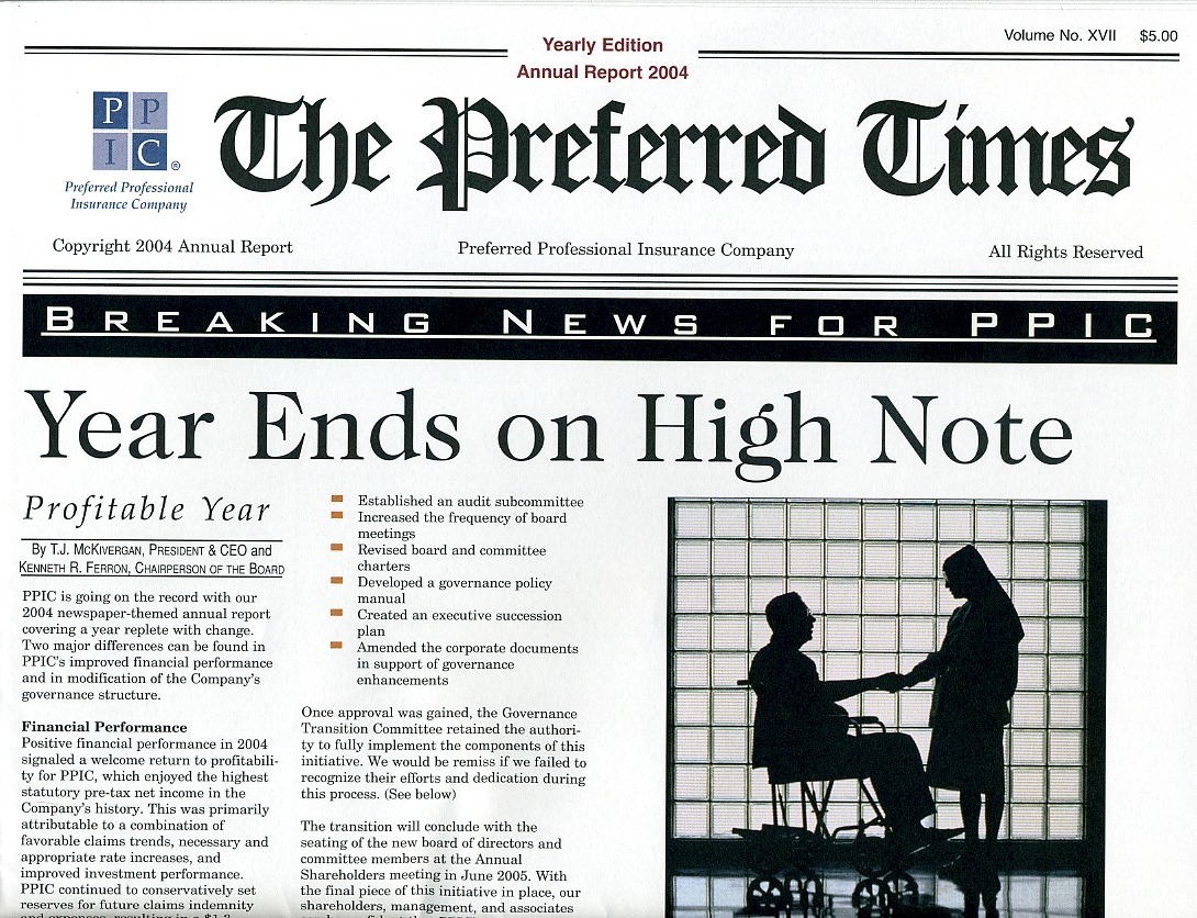 Download This Year's Entry Form Annual Report Highlights: View Competition Class Performance | Company Name: | PPIC    | | Company Web Site: | www.ppicins.com | | Annual Revenue: | $100 Million - $1 Billion | | Employee Base: | Up to 100 Employees | | Core Industry: | Insurance | Approximate Number of Pages (Narrative/Financial Percent): | 16 (50.0%/50.0%) | | Notable Feature(s): | Outer Folder, Cartoon(s), Newspaper Format, Parody / Humor | | Award Garnered: | Gold | | | | Judging Results | | First Impression: | | | Report Cover: | | | Letter to Shareholders: | | | Report Narrative: | | | Report Financials: | | | Creativity: | | | Message Clarity: | | | Information Accessibility: | | | Total Score: | |