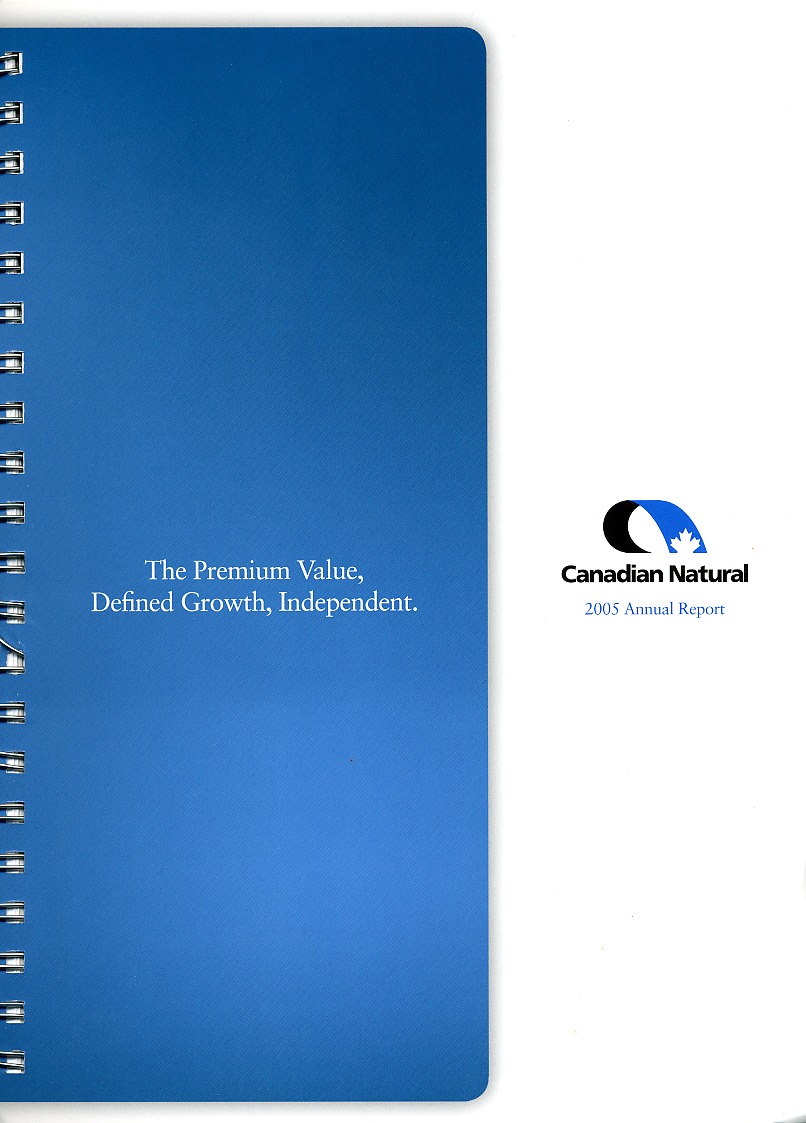 Download This Year's Entry Form Annual Report Highlights: View Competition Class Performance | Company/Agency Name: | Canadian Natural Resources Limited    / nonfiction studios inc. | | Company/Agency Web Site: | www.cnrl.com / www.nonfiction.ca | | Company Ticker Symbol: | CNQ | | Annual Revenue: | $1+ Billion | | Employee Base: | 1,000 - 10,000 Employees | | Core Industry: | Energy - Oil, Gas & Consumable Fuels | Approximate Number of Pages (Narrative/Financial Percent): | 208 (21.2%/78.8%) | | Notable Feature(s): | Glossary, Narrative Fold-Out / Gatefold | | Award Garnered: | Gold | | Top 100 Rank: | 52 | | | | Judging Results | | First Impression: | | | Report Cover: | | | Letter to Shareholders: | | | Report Narrative: | | | Report Financials: | | | Creativity: | | | Message Clarity: | | | Information Accessibility: | | | Total Score: | |