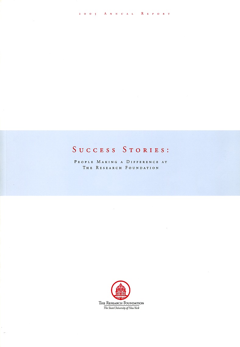Download This Year's Entry Form Annual Report Highlights: View Competition Class Performance | Company Name: | Research Foundation of SUNY    | | Company Web Site: | www.rfsuny.org | | Annual Revenue: | $100 Million - $1 Billion | | Employee Base: | 10,000+ Employees | | Core Industry: | Non-Profits | Approximate Number of Pages (Narrative/Financial Percent): | 36 (55.6%/44.4%) | | Award Garnered: | Honors | | | | Judging Results | | First Impression: | | | Report Cover: | | | Letter to Shareholders: | | | Report Narrative: | | | Report Financials: | | | Creativity: | | | Message Clarity: | | | Information Accessibility: | | | Total Score: | |