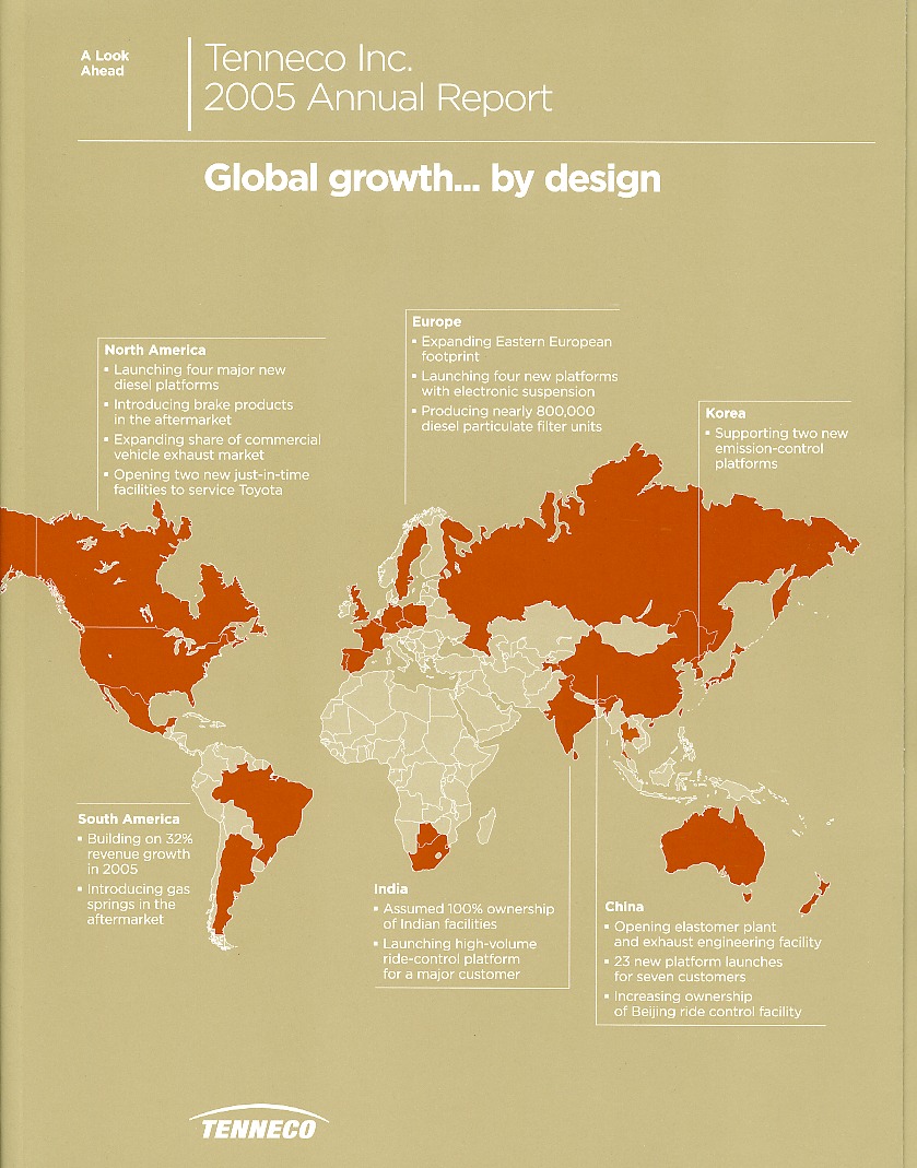 Download This Year's Entry Form Annual Report Highlights: View Competition Class Performance | Company/Agency Name: | Tenneco Automotive    / Meta 4 Design, Inc. | | Company/Agency Web Site: | www.tenneco-automotive.com / www.meta4design.com | | Company Ticker Symbol: | TEN | | Annual Revenue: | $1+ Billion | | Employee Base: | 10,000+ Employees | | Core Industry: | Automobiles & Components | Approximate Number of Pages (Narrative/Financial Percent): | 162 (9.9%/90.1%) | | Notable Feature(s): | Fold-Out Cover | | Award Garnered: | Honors | | | | Judging Results | | First Impression: | | | Report Cover: | | | Letter to Shareholders: | | | Report Narrative: | | | Report Financials: | | | Creativity: | | | Message Clarity: | | | Information Accessibility: | | | Total Score: | |
