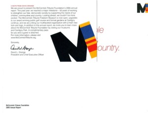 Download This Year's Entry Form Annual Report Highlights: View Competition Class Performance | Company/Agency Name: | McCormick Tribune Foundation    / Meta 4 Design, Inc. | | Company/Agency Web Site: | www.mccormicktribune.org / www.meta4design.com | | Annual Revenue: | $100 Million - $1 Billion | | Employee Base: | 1,000 - 10,000 Employees | | Core Industry: | Non-Profits | Approximate Number of Pages (Narrative/Financial Percent): | 28 (78.6%/21.4%) | | Notable Feature(s): | Non-10K / MD&A Pull-Out(s), Enclosed Coupon | | Award Garnered: | Silver | | | | Judging Results | | First Impression: | | | Report Cover: | | | Letter to Shareholders: | | | Report Narrative: | | | Report Financials: | | | Creativity: | | | Message Clarity: | | | Information Accessibility: | | | Total Score: | |