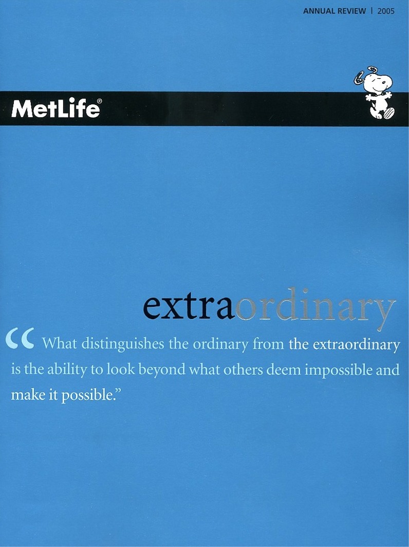 Download This Year's Entry Form Annual Report Highlights: View Competition Class Performance | Company Name: | MetLife, Inc.    | | Company Web Site: | www.metlife.com | | Company Ticker Symbol: | MET | | Annual Revenue: | $1+ Billion | | Employee Base: | 10,000+ Employees | | Core Industry: | Insurance | Approximate Number of Pages (Narrative/Financial Percent): | 28 (100.0%/0.0%) | | Award Garnered: | Silver | | | | Judging Results | | First Impression: | | | Report Cover: | | | Letter to Shareholders: | | | Report Narrative: | | | Report Financials: | | | Creativity: | | | Message Clarity: | | | Information Accessibility: | | | Total Score: | |