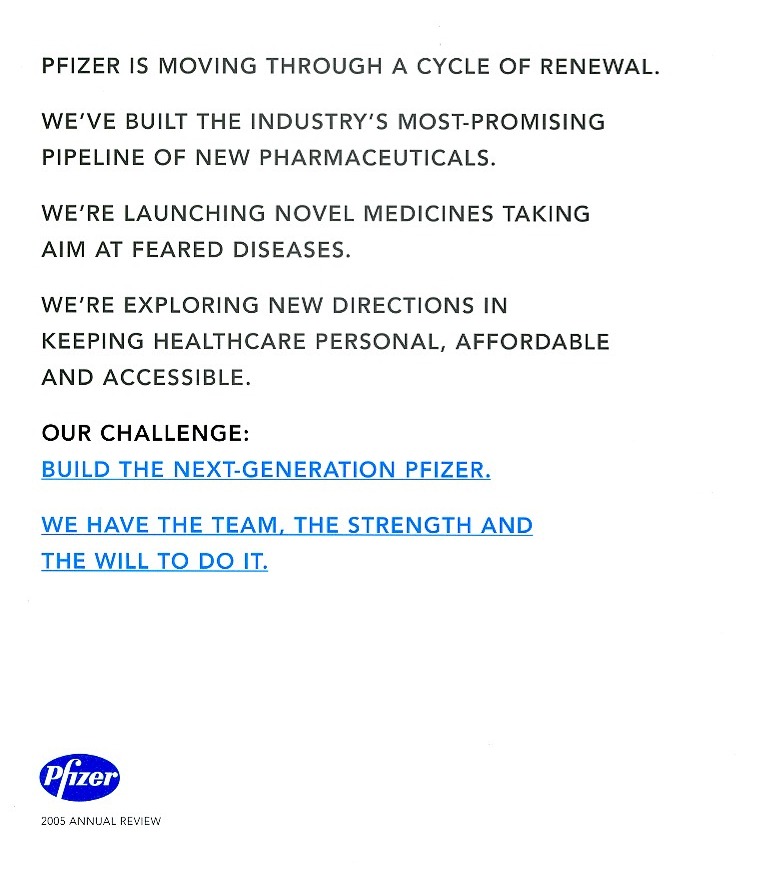 Download This Year's Entry Form Annual Report Highlights: View Competition Class Performance | Company/Agency Name: | Pfizer    / Ideas on Purpose | | Company/Agency Web Site: | www.pfizer.com / www.ideasonpurpose.com | | Company Ticker Symbol: | PFE | | Annual Revenue: | $1+ Billion | | Employee Base: | 10,000+ Employees | | Core Industry: | Pharmaceuticals | Approximate Number of Pages (Narrative/Financial Percent): | 36 (100.0%/0.0%) | | Award Garnered: | Honors | | | | Judging Results | | First Impression: | | | Report Cover: | | | Letter to Shareholders: | | | Report Narrative: | | | Report Financials: | | | Creativity: | | | Message Clarity: | | | Information Accessibility: | | | Total Score: | |