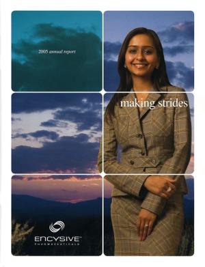 Download This Year's Entry Form Annual Report Highlights: View Competition Class Performance | Company/Agency Name: | Encysive Pharmaceuticals    / Mentus | | Company/Agency Web Site: | www.encysive.com / www.mentus.com | | Company Ticker Symbol: | ENCY | | Annual Revenue: | $10 Million - $100 Million | | Employee Base: | Up to 100 Employees | | Core Industry: | Biotechnology | Approximate Number of Pages (Narrative/Financial Percent): | 8 (100.0%/0.0%) | | Award Garnered: | Honors | | | | Judging Results | | First Impression: | | | Report Cover: | | | Letter to Shareholders: | | | Report Narrative: | | | Report Financials: | | | Creativity: | | | Message Clarity: | | | Information Accessibility: | | | Total Score: | |