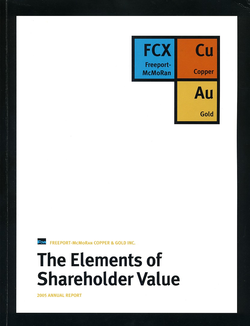 Download This Year's Entry Form Annual Report Highlights: View Competition Class Performance | Company/Agency Name: | Freeport-McMoRan Copper & Gold Inc.    / Eisenberg And Associates | | Company/Agency Web Site: | www.fcx.com / www.eisenberg-inc.com | | Company Ticker Symbol: | FCX | | Annual Revenue: | $1+ Billion | | Employee Base: | 10,000+ Employees | | Core Industry: | Materials | Approximate Number of Pages (Narrative/Financial Percent): | 90 (24.4%/75.6%) | | Award Garnered: | Bronze | | | | Judging Results | | First Impression: | | | Report Cover: | | | Letter to Shareholders: | | | Report Narrative: | | | Report Financials: | | | Creativity: | | | Message Clarity: | | | Information Accessibility: | | | Total Score: | |