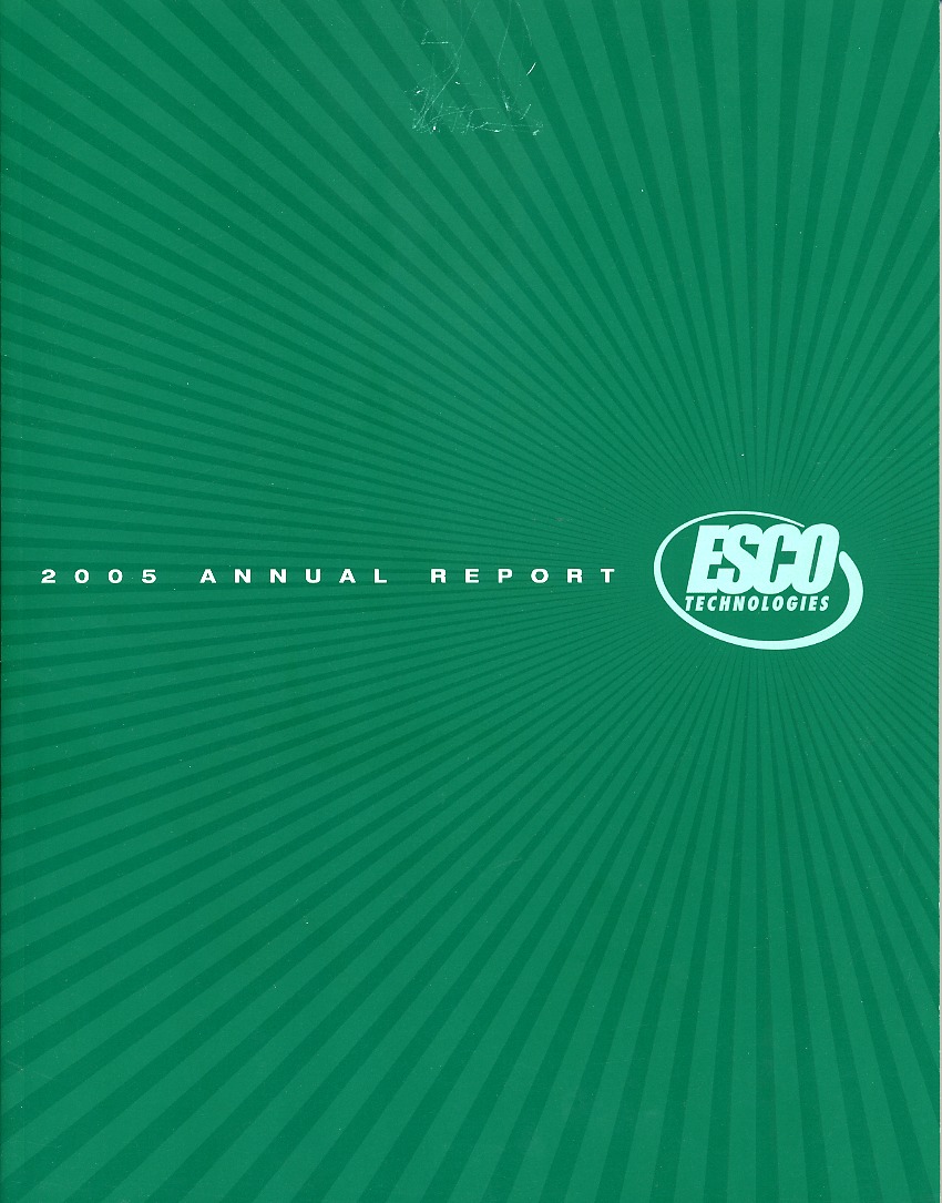 Download This Year's Entry Form Annual Report Highlights: View Competition Class Performance | Company/Agency Name: | ESCO Technologies, Inc.    / Obata Design, Inc. | | Company/Agency Web Site: | www.escotechnologies.com / www.obatadesign.com | | Company Ticker Symbol: | ESE | | Annual Revenue: | $100 Million - $1 Billion | | Employee Base: | 1,000 - 10,000 Employees | | Core Industry: | Technology - Computers, Hardware, Semiconductors, Equipment & Peripherals | Approximate Number of Pages (Narrative/Financial Percent): | 56 (17.9%/82.1%) | | Award Garnered: | Gold | | | | Judging Results | | First Impression: | | | Report Cover: | | | Letter to Shareholders: | | | Report Narrative: | | | Report Financials: | | | Creativity: | | | Message Clarity: | | | Information Accessibility: | | | Total Score: | |