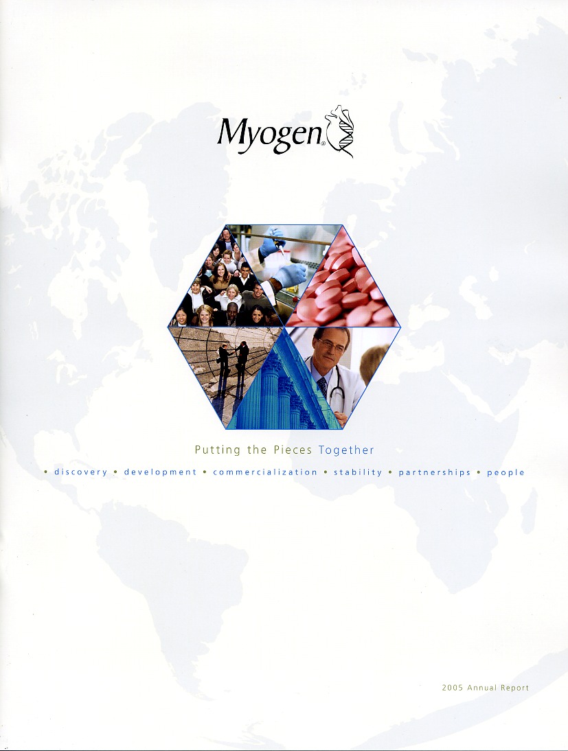 Download This Year's Entry Form Annual Report Highlights: View Competition Class Performance | Company/Agency Name: | Myogen, Inc.    / Curran & Connors | | Company/Agency Web Site: | www.myogen.com / www.curran-connors.com | | Company Ticker Symbol: | MYOG | | Annual Revenue: | Up to $10 Million | | Employee Base: | 100 - 1,000 Employees | | Core Industry: | Biotechnology | Approximate Number of Pages (Narrative/Financial Percent): | 12 (100.0%/0.0%) | | Award Garnered: | Honors | | | | Judging Results | | First Impression: | | | Report Cover: | | | Letter to Shareholders: | | | Report Narrative: | | | Report Financials: | | | Creativity: | | | Message Clarity: | | | Information Accessibility: | | | Total Score: | |