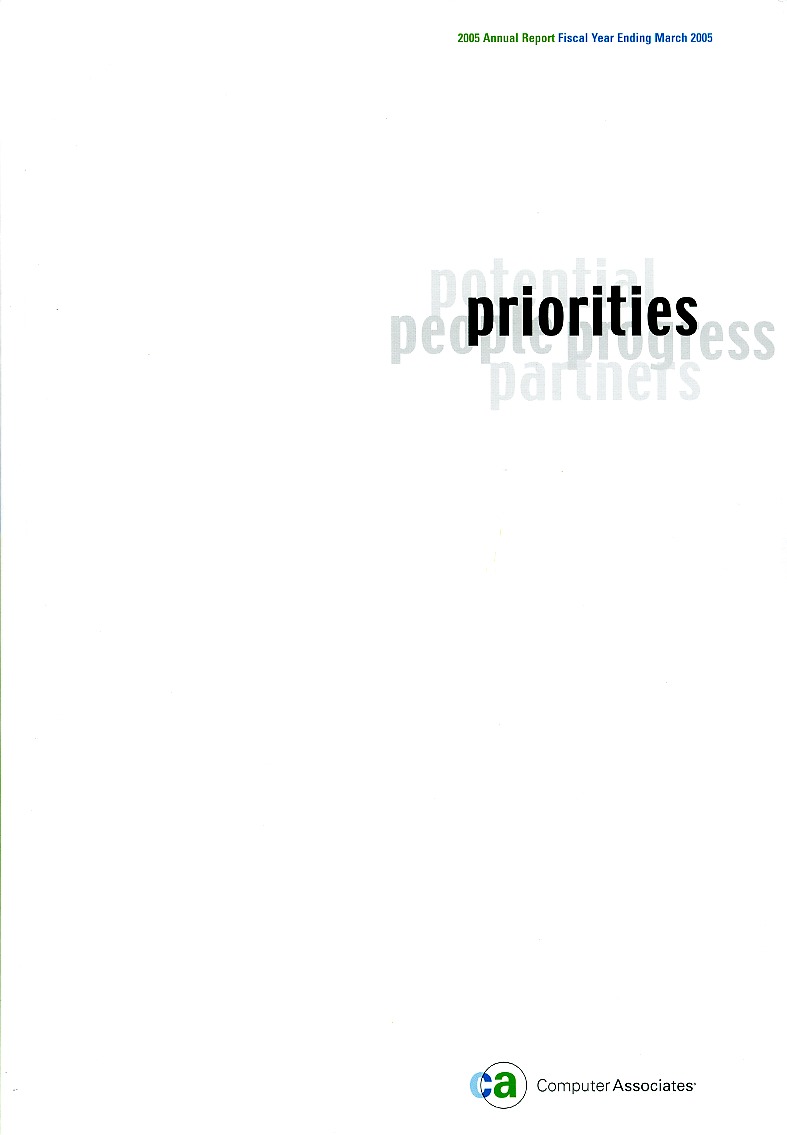 Download This Year's Entry Form Annual Report Highlights: View Competition Class Performance | Company/Agency Name: | Computer Associates    / Weber Shandwick | | Company/Agency Web Site: | www.ca.com / www.webershandwick.com | | Company Ticker Symbol: | CA | | Annual Revenue: | $1+ Billion | | Employee Base: | 10,000+ Employees | | Core Industry: | Technology - I.T. Services | Approximate Number of Pages (Narrative/Financial Percent): | 124 (21.0%/79.0%) | | Award Garnered: | Silver | | | | Judging Results | | First Impression: | | | Report Cover: | | | Letter to Shareholders: | | | Report Narrative: | | | Report Financials: | | | Creativity: | | | Message Clarity: | | | Information Accessibility: | | | Total Score: | |
