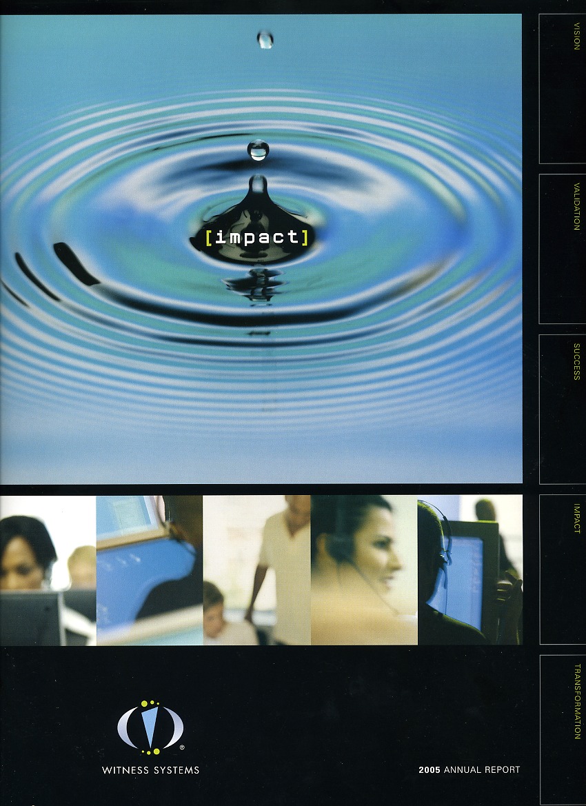 Download This Year's Entry Form Annual Report Highlights: View Competition Class Performance | Company/Agency Name: | Witness Systems    / DesignLogix | | Company/Agency Web Site: | www.witness.com / www.designlogix.com | | Company Ticker Symbol: | WITS | | Annual Revenue: | $100 Million - $1 Billion | | Employee Base: | 100 - 1,000 Employees | | Core Industry: | Technology - Software | Approximate Number of Pages (Narrative/Financial Percent): | 96 (16.7%/83.3%) | | Notable Feature(s): | Tabs (Cut or Printed) | | Award Garnered: | Gold | | | | Judging Results | | First Impression: | | | Report Cover: | | | Letter to Shareholders: | | | Report Narrative: | | | Report Financials: | | | Creativity: | | | Message Clarity: | | | Information Accessibility: | | | Total Score: | |