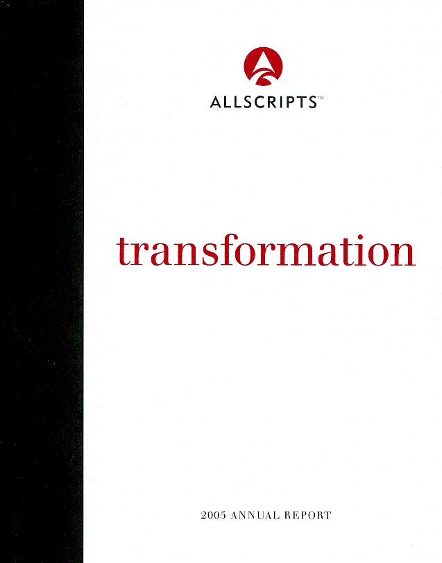 Download This Year's Entry Form Annual Report Highlights: View Competition Class Performance | Company/Agency Name: | Allscripts    / Paragraphs Design | | Company/Agency Web Site: | www.allscripts.com / www.paragraphs.com | | Company Ticker Symbol: | MDRX | | Annual Revenue: | $100 Million - $1 Billion | | Employee Base: | 100 - 1,000 Employees | | Core Industry: | Technology - I.T. Services | Approximate Number of Pages (Narrative/Financial Percent): | 110 (21.8%/78.2%) | | Award Garnered: | Bronze | | | | Judging Results | | First Impression: | | | Report Cover: | | | Letter to Shareholders: | | | Report Narrative: | | | Report Financials: | | | Creativity: | | | Message Clarity: | | | Information Accessibility: | | | Total Score: | |