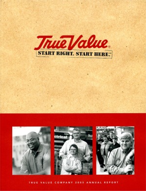 Download This Year's Entry Form Annual Report Highlights: View Competition Class Performance | Company/Agency Name: | True Value Company    / Edelman Design Communications | | Company/Agency Web Site: | www.truevalue.com / www.edelman.com | | Annual Revenue: | $1+ Billion | | Employee Base: | 1,000 - 10,000 Employees | | Core Industry: | Retailing | Approximate Number of Pages (Narrative/Financial Percent): | 46 (21.7%/78.3%) | | Award Garnered: | Bronze | | | | Judging Results | | First Impression: | | | Report Cover: | | | Letter to Shareholders: | | | Report Narrative: | | | Report Financials: | | | Creativity: | | | Message Clarity: | | | Information Accessibility: | | | Total Score: | |