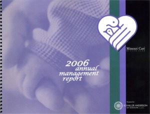 Download This Year's Entry Form Annual Report Highlights: View Competition Class Performance | Company Name: | MissouriCare Health Plan    | | Company Web Site: | www.missouricare.com | | Annual Revenue: | $10 Million - $100 Million | | Employee Base: | Up to 100 Employees | | Core Industry: | Health Care - Providers & Services | Approximate Number of Pages (Narrative/Financial Percent): | 28 (100.0%/0.0%) | | Award Garnered: | Honors | | | | Judging Results | | First Impression: | | | Report Cover: | | | Letter to Shareholders: | | | Report Narrative: | | | Report Financials: | | | Creativity: | | | Message Clarity: | | | Information Accessibility: | | | Total Score: | |