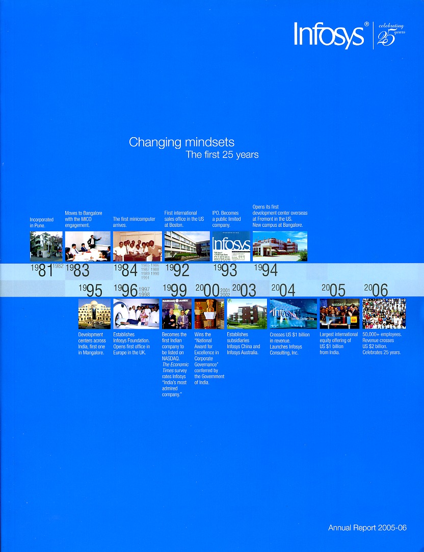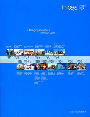 Download This Year's Entry Form Annual Report Highlights: View Competition Class Performance | Company Name: | Infosys Technologies Ltd.    | | Company Web Site: | www.infosys.com | | Annual Revenue: | $1+ Billion | | Employee Base: | 10,000+ Employees | | Core Industry: | Technology - I.T. Services | Approximate Number of Pages (Narrative/Financial Percent): | 290 (8.3%/91.7%) | | Notable Feature(s): | Outer Folder, Narrative Fold-Out / Gatefold | | Award Garnered: | Gold | | Top 100 Rank: | 61 | | | | Judging Results | | First Impression: | | | Report Cover: | | | Letter to Shareholders: | | | Report Narrative: | | | Report Financials: | | | Creativity: | | | Message Clarity: | | | Information Accessibility: | | | Total Score: | |