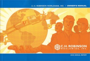 Download This Year's Entry Form Annual Report Highlights: View Competition Class Performance | Company Name: | C.H. Robinson Worldwide    | | Company Web Site: | www.chrobinson.com | | Company Ticker Symbol: | CHRW | | Annual Revenue: | $1+ Billion | | Employee Base: | 1,000 - 10,000 Employees | | Core Industry: | Transportation & Logistics | Approximate Number of Pages (Narrative/Financial Percent): | 70 (45.7%/54.3%) | | Award Garnered: | Silver | | | | Judging Results | | First Impression: | | | Report Cover: | | | Letter to Shareholders: | | | Report Narrative: | | | Report Financials: | | | Creativity: | | | Message Clarity: | | | Information Accessibility: | | | Total Score: | |
