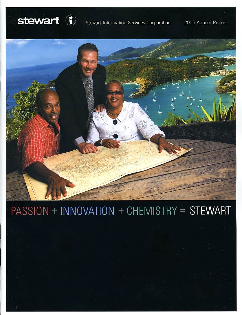 Download This Year's Entry Form Annual Report Highlights: View Competition Class Performance | Company Name: | Stewart Information Services Corp.    | | Company Web Site: | www.stewart.com | | Company Ticker Symbol: | STC | | Annual Revenue: | $1+ Billion | | Employee Base: | 1,000 - 10,000 Employees | | Core Industry: | Insurance | Approximate Number of Pages (Narrative/Financial Percent): | 40 (40.0%/60.0%) | | Award Garnered: | Bronze | | | | Judging Results | | First Impression: | | | Report Cover: | | | Letter to Shareholders: | | | Report Narrative: | | | Report Financials: | | | Creativity: | | | Message Clarity: | | | Information Accessibility: | | | Total Score: | |