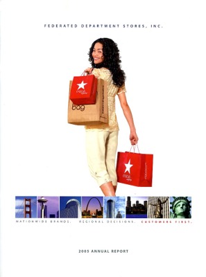 Download This Year's Entry Form Annual Report Highlights: View Competition Class Performance | Company/Agency Name: | Federated Department Stores    / Sanger & Eby | | Company/Agency Web Site: | www.fds.com / www.sangereby.com | | Company Ticker Symbol: | FD | | Annual Revenue: | $1+ Billion | | Employee Base: | 10,000+ Employees | | Core Industry: | Retailing | Approximate Number of Pages (Narrative/Financial Percent): | 106 (11.3%/88.7%) | | Award Garnered: | Honors | | | | Judging Results | | First Impression: | | | Report Cover: | | | Letter to Shareholders: | | | Report Narrative: | | | Report Financials: | | | Creativity: | | | Message Clarity: | | | Information Accessibility: | | | Total Score: | |