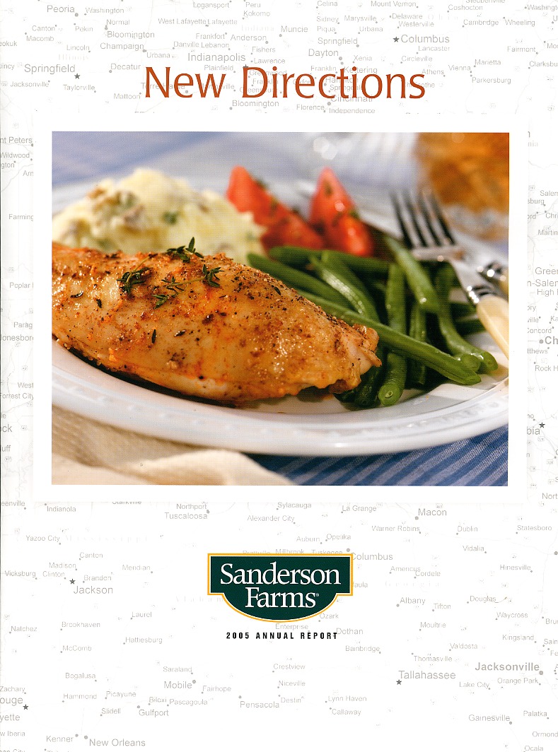 Download This Year's Entry Form Annual Report Highlights: View Competition Class Performance | Company/Agency Name: | Sanderson Farms    / Corporate Design | | Company/Agency Web Site: | www.sandersonfarms.com / www.corpdesigninc.com | | Company Ticker Symbol: | SAFM | | Annual Revenue: | $100 Million - $1 Billion | | Employee Base: | 1,000 - 10,000 Employees | | Core Industry: | Consumer Consumables - Food/Beverage | Approximate Number of Pages (Narrative/Financial Percent): | 48 (41.7%/58.3%) | | Award Garnered: | Silver | | | | Judging Results | | First Impression: | | | Report Cover: | | | Letter to Shareholders: | | | Report Narrative: | | | Report Financials: | | | Creativity: | | | Message Clarity: | | | Information Accessibility: | | | Total Score: | |
