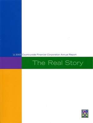 Download This Year's Entry Form Annual Report Highlights: View Competition Class Performance | Company/Agency Name: | Countrywide Financial Corp.    / Praxis | | Company/Agency Web Site: | www.countrywide.com / www.praxisls.com | | Company Ticker Symbol: | CFC | | Annual Revenue: | $1+ Billion | | Employee Base: | 10,000+ Employees | | Core Industry: | Financials - Capital Markets & Diversified Services | Approximate Number of Pages (Narrative/Financial Percent): | 254 (11.8%/88.2%) | | Award Garnered: | Gold | | Top 100 Rank: | 75 | | | | Judging Results | | First Impression: | | | Report Cover: | | | Letter to Shareholders: | | | Report Narrative: | | | Report Financials: | | | Creativity: | | | Message Clarity: | | | Information Accessibility: | | | Total Score: | |