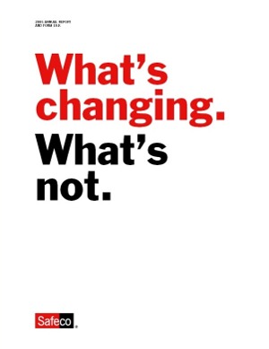 Download This Year's Entry Form Annual Report Highlights: View Competition Class Performance | Company/Agency Name: | Safeco    / Methodologie | | Company/Agency Web Site: | www.safeco.com / www.methodologie.com | | Company Ticker Symbol: | SAFC | | Annual Revenue: | $1+ Billion | | Employee Base: | 1,000 - 10,000 Employees | | Core Industry: | Insurance | Approximate Number of Pages (Narrative/Financial Percent): | 112 (8.9%/91.1%) | | Award Garnered: | Gold | | | | Judging Results | | First Impression: | | | Report Cover: | | | Letter to Shareholders: | | | Report Narrative: | | | Report Financials: | | | Creativity: | | | Message Clarity: | | | Information Accessibility: | | | Total Score: | |