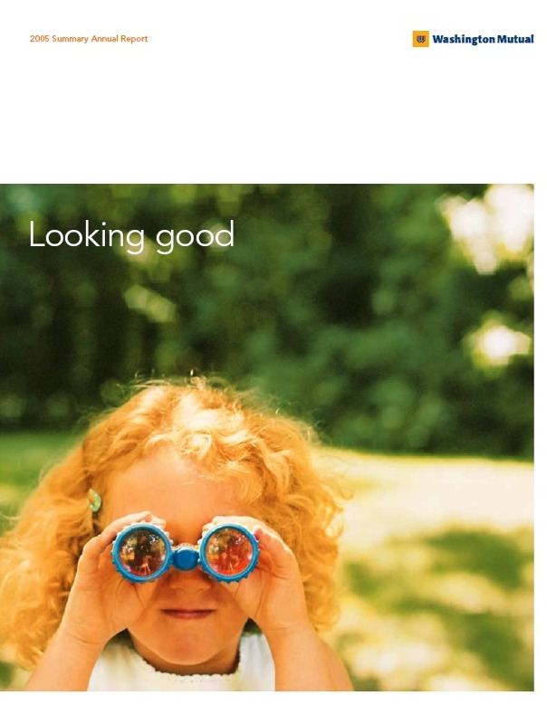 Download This Year's Entry Form Annual Report Highlights: View Competition Class Performance | Company/Agency Name: | Washington Mutual    / Methodologie | | Company/Agency Web Site: | www.wamu.com / www.methodologie.com | | Company Ticker Symbol: | WM | | Annual Revenue: | $1+ Billion | | Employee Base: | 10,000+ Employees | | Core Industry: | Banks | Approximate Number of Pages (Narrative/Financial Percent): | 32 (87.5%/12.5%) | | Award Garnered: | Silver | | Top 100 Rank: | 82 | | | | Judging Results | | First Impression: | | | Report Cover: | | | Letter to Shareholders: | | | Report Narrative: | | | Report Financials: | | | Creativity: | | | Message Clarity: | | | Information Accessibility: | | | Total Score: | |