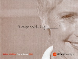 Download This Year's Entry Form Annual Report Highlights: View Competition Class Performance | Company Name: | Mather LifeWays    | | Company Web Site: | www.matherlifeways.com | | Annual Revenue: | $10 Million - $100 Million | | Employee Base: | 100 - 1,000 Employees | | Core Industry: | Non-Profits | Approximate Number of Pages: (Narrative/Financial Percent) | 12 (100.0%/0.0%) | | Award Garnered: | Honors | | | | Judging Results | | First Impression: | | | Report Cover: | | | Letter to Shareholders: | | | Report Narrative: | | | Report Financials: | | | Creativity: | | | Message Clarity: | | | Information Accessibility: | | | Total Score: | |