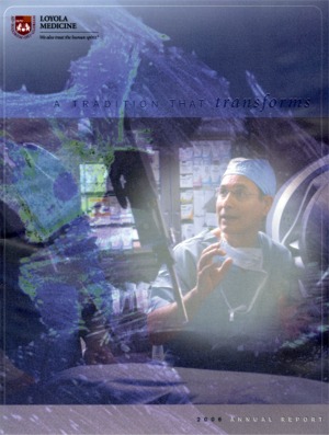 Download This Year's Entry Form Annual Report Highlights: View Competition Class Performance | Company/Agency Name: | Loyola University Health System    / Aloysius Butler & Clark | | Company/Agency Web Site: | www.loyolamedicine.com / a-b-c.com | | Annual Revenue: | $100 Million - $1 Billion | | Employee Base: | 1,000 - 10,000 Employees | | Core Industry: | Health Care - Providers & Services | Approximate Number of Pages: (Narrative/Financial Percent) | 20 (90.0%/10.0%) | | Notable Feature(s): | Translucent Page(s) | | Award Garnered: | Silver | | | | Judging Results | | First Impression: | | | Report Cover: | | | Letter to Shareholders: | | | Report Narrative: | | | Report Financials: | | | Creativity: | | | Message Clarity: | | | Information Accessibility: | | | Total Score: | |