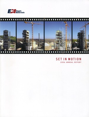 Download This Year's Entry Form Annual Report Highlights: View Competition Class Performance | Company/Agency Name: | Eagle Materials, Inc.    / Eisenberg and Associates | | Company/Agency Web Site: | www.eaglematerials.com / www.eisenberg-inc.com | | Company Ticker Symbol: | EXP | | Annual Revenue: | $100 Million - $1 Billion | | Employee Base: | 1,000 - 10,000 Employees | | Core Industry: | Materials | Approximate Number of Pages: (Narrative/Financial Percent) | 92 (17.4%/82.6%) | | Award Garnered: | Honors | | | | Judging Results | | First Impression: | | | Report Cover: | | | Letter to Shareholders: | | | Report Narrative: | | | Report Financials: | | | Creativity: | | | Message Clarity: | | | Information Accessibility: | | | Total Score: | |