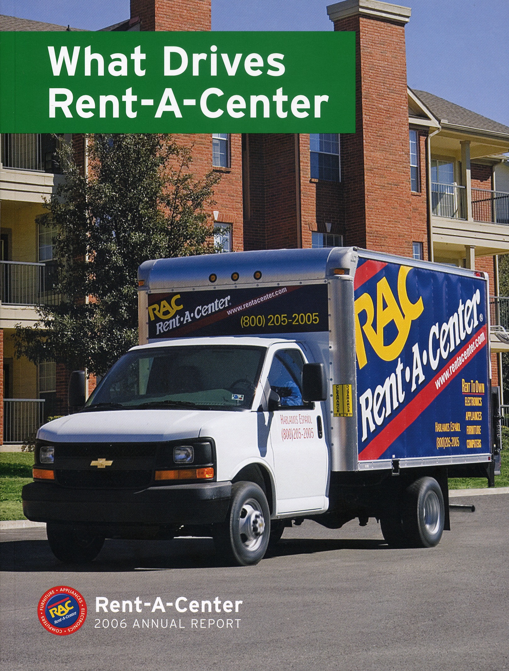 Download This Year's Entry Form Annual Report Highlights: View Competition Class Performance | Company/Agency Name: | Rent-A-Center    / Eisenberg and Associates | | Company/Agency Web Site: | www.rentacenter.com / www.eisenberg-inc.com | | Company Ticker Symbol: | RCII | | Annual Revenue: | $1+ Billion | | Employee Base: | 1,000 - 10,000 Employees | | Core Industry: | Retailing | Approximate Number of Pages: (Narrative/Financial Percent) | 102 (11.8%/88.2%) | | Award Garnered: | Honors | | | | Judging Results | | First Impression: | | | Report Cover: | | | Letter to Shareholders: | | | Report Narrative: | | | Report Financials: | | | Creativity: | | | Message Clarity: | | | Information Accessibility: | | | Total Score: | |