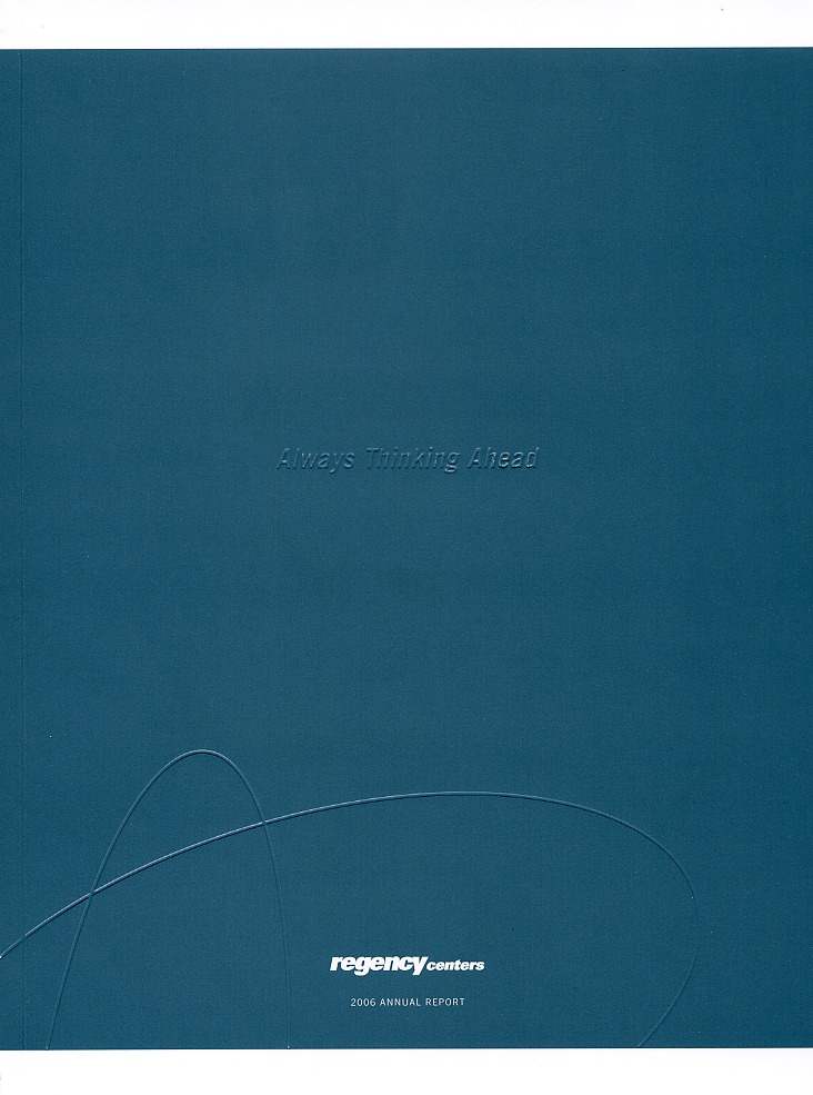 Download This Year's Entry Form Annual Report Highlights: View Competition Class Performance | Company/Agency Name: | Regency Centers    / Curran & Connors | | Company/Agency Web Site: | www.regencycenters.com / www.curran-connors.com | | Company Ticker Symbol: | REG | | Annual Revenue: | $100 Million - $1 Billion | | Employee Base: | 100 - 1,000 Employees | | Core Industry: | Real Estate/REIT | Approximate Number of Pages: (Narrative/Financial Percent) | 90 (33.3%/66.7%) | | Notable Feature(s): | Embossed Cover | | Award Garnered: | Silver | | | | Judging Results | | First Impression: | | | Report Cover: | | | Letter to Shareholders: | | | Report Narrative: | | | Report Financials: | | | Creativity: | | | Message Clarity: | | | Information Accessibility: | | | Total Score: | |