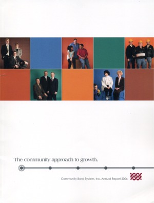 Download This Year's Entry Form Annual Report Highlights: View Competition Class Performance | Company/Agency Name: | Community Bank System    / Travers Collins & Company | | Company/Agency Web Site: | www.communitybankna.com / www.traverscollins.com | | Company Ticker Symbol: | CBU | | Annual Revenue: | $1+ Billion | | Employee Base: | 1,000 - 10,000 Employees | | Core Industry: | Banks -- Commercial | Approximate Number of Pages: (Narrative/Financial Percent) | 96 (18.8%/81.3%) | | Notable Feature(s): | Glossary | | Award Garnered: | Bronze | | | | Judging Results | | First Impression: | | | Report Cover: | | | Letter to Shareholders: | | | Report Narrative: | | | Report Financials: | | | Creativity: | | | Message Clarity: | | | Information Accessibility: | | | Total Score: | |