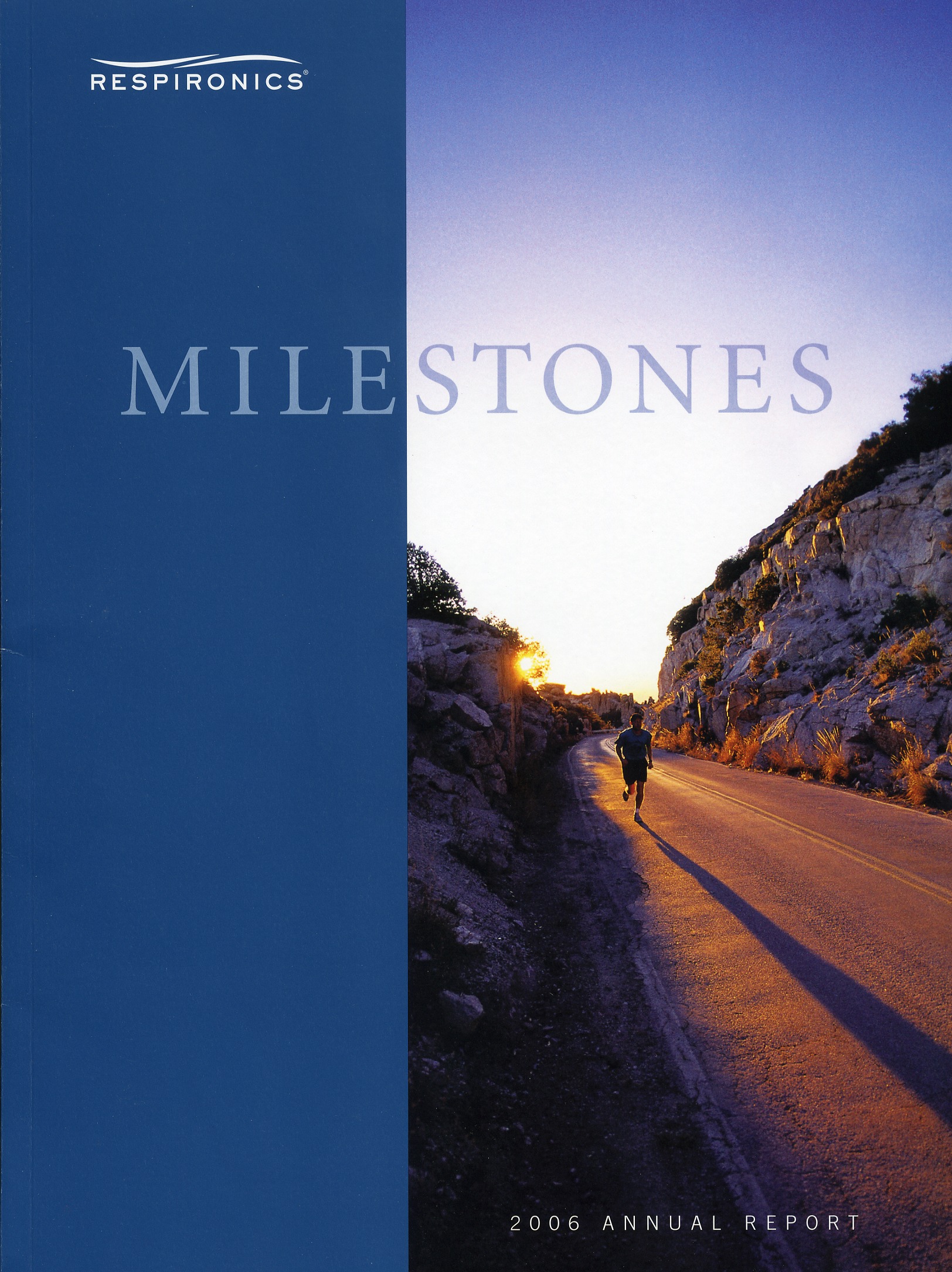 Download This Year's Entry Form Annual Report Highlights: View Competition Class Performance | Company/Agency Name: | Respironics    / Bradley Brown Design | | Company/Agency Web Site: | www.respironics.com / www.bradleybrowndesign.com | | Company Ticker Symbol: | RESP | | Annual Revenue: | $1+ Billion | | Employee Base: | 1,000 - 10,000 Employees | | Core Industry: | Health Care - Equipment & Supplies | Approximate Number of Pages: (Narrative/Financial Percent) | 60 (26.7%/73.3%) | | Notable Feature(s): | Organizational Timeline | | Award Garnered: | Bronze | | | | Judging Results | | First Impression: | | | Report Cover: | | | Letter to Shareholders: | | | Report Narrative: | | | Report Financials: | | | Creativity: | | | Message Clarity: | | | Information Accessibility: | | | Total Score: | |