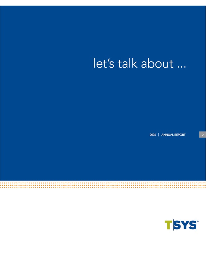 Download This Year's Entry Form Annual Report Highlights: View Competition Class Performance | Company Name: | TSYS    | | Company Web Site: | www.tsys.com | | Company Ticker Symbol: | TSS | | Annual Revenue: | $100 Million - $1 Billion | | Employee Base: | 1,000 - 10,000 Employees | | Core Industry: | Technology - I.T. Services | Approximate Number of Pages: (Narrative/Financial Percent) | 94 (21.3%/78.7%) | | Award Garnered: | Honors | | | | Judging Results | | First Impression: | | | Report Cover: | | | Letter to Shareholders: | | | Report Narrative: | | | Report Financials: | | | Creativity: | | | Message Clarity: | | | Information Accessibility: | | | Total Score: | |