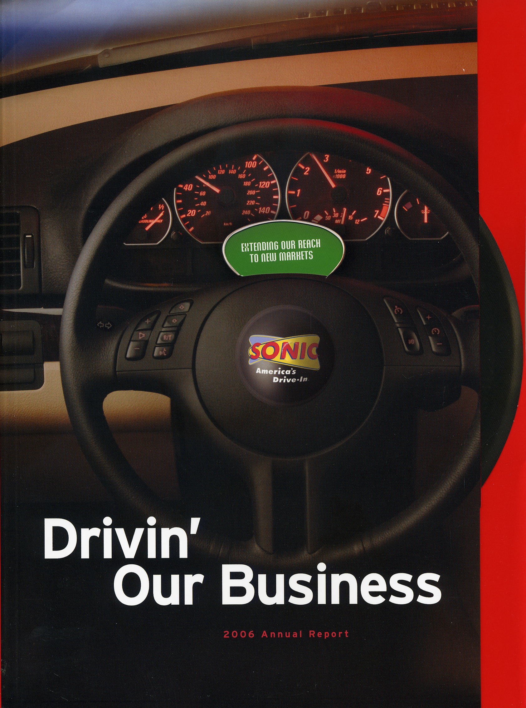 Download This Year's Entry Form Annual Report Highlights: View Competition Class Performance | Company/Agency Name: | Sonic Corporation    / Corporate Communications Inc. | | Company/Agency Web Site: | www.sonicdrivein.com / www.cci-ir.com | | Company Ticker Symbol: | SONC | | Annual Revenue: | $100 Million - $1 Billion | | Employee Base: | 1,000 - 10,000 Employees | | Core Industry: | Consumer Services - Hotels/Restaurants/Leisure | Approximate Number of Pages: (Narrative/Financial Percent) | 56 (28.6%/71.4%) | | Notable Feature(s): | Unique Cover Material | | Award Garnered: | Platinum | | Top 100 Rank: | 69 | | | | Judging Results | | First Impression: | | | Report Cover: | | | Letter to Shareholders: | | | Report Narrative: | | | Report Financials: | | | Creativity: | | | Message Clarity: | | | Information Accessibility: | | | Total Score: | |