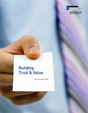 Download This Year's Entry Form Annual Report Highlights: View Competition Class Performance | Company/Agency Name: | SAENGBO Real Estate Trust    / IRKUDOS | | Company/Agency Web Site: | www.sbnet.co.kr/eng / www.irkudos.co.kr | | Annual Revenue: | $10 Million - $100 Million | | Employee Base: | Up to 100 Employees | | Core Industry: | Real Estate/REIT | Approximate Number of Pages: (Narrative/Financial Percent) | 34 (100.0%/0.0%) | | Notable Feature(s): | Outer Folder | | Award Garnered: | Silver | | | | Judging Results | | First Impression: | | | Report Cover: | | | Letter to Shareholders: | | | Report Narrative: | | | Report Financials: | | | Creativity: | | | Message Clarity: | | | Information Accessibility: | | | Total Score: | |