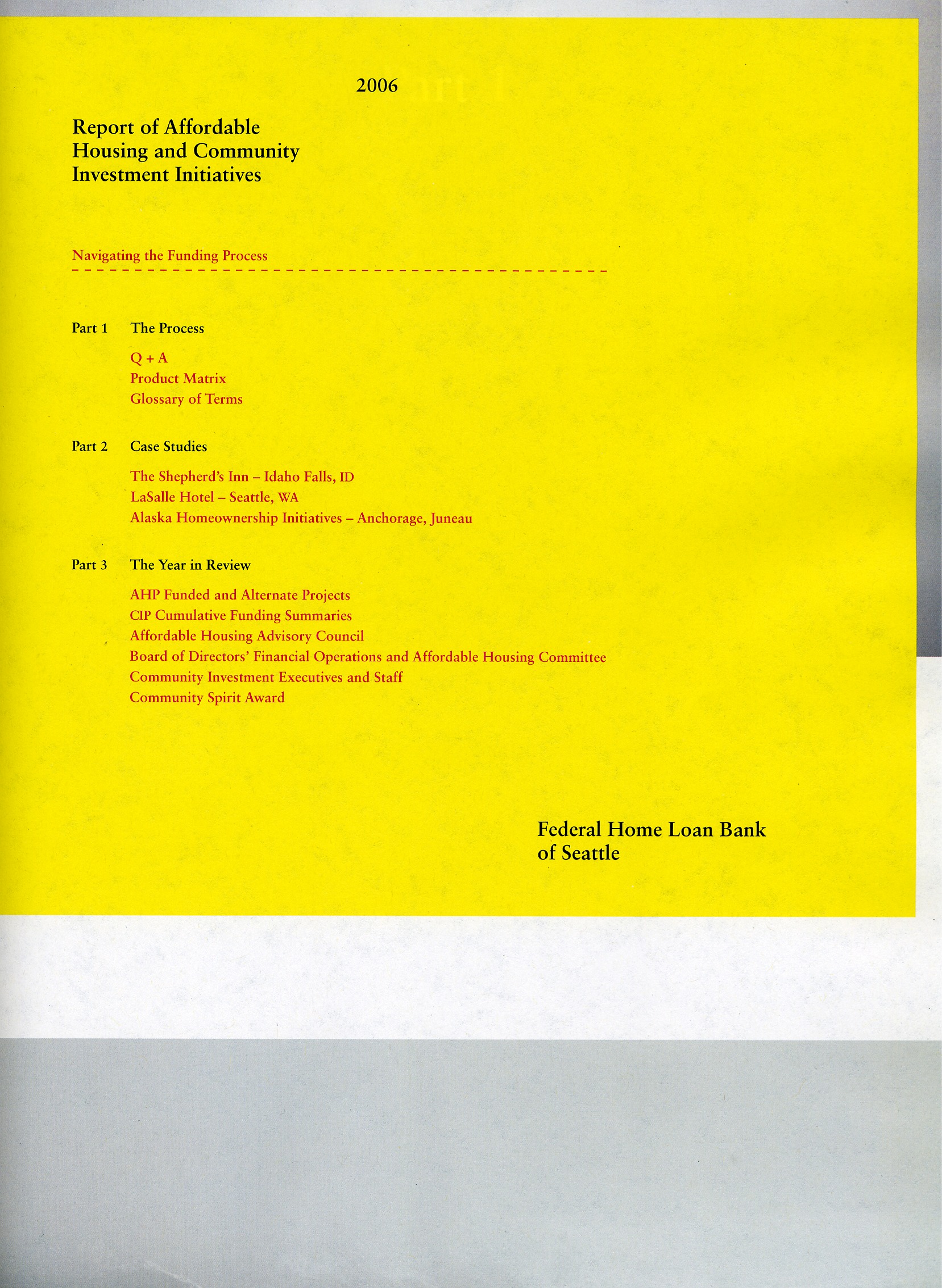 Download This Year's Entry Form Annual Report Highlights: View Competition Class Performance | Company/Agency Name: | Federal Home Loan Bank of Seattle    / Methodologie | | Company/Agency Web Site: | www.fhlbsea.com / www.methodologie.com | | Annual Revenue: | $1+ Billion | | Employee Base: | 100 - 1,000 Employees | | Core Industry: | Banks -- Thrifts & Mortgage Finance | Approximate Number of Pages: (Narrative/Financial Percent) | 36 (100.0%/0.0%) | | Award Garnered: | Gold | | | | Judging Results | | First Impression: | | | Report Cover: | | | Letter to Shareholders: | | | Report Narrative: | | | Report Financials: | | | Creativity: | | | Message Clarity: | | | Information Accessibility: | | | Total Score: | |