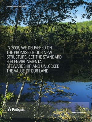 Download This Year's Entry Form Annual Report Highlights: View Competition Class Performance | Company/Agency Name: | Potlach    / Methodologie | | Company/Agency Web Site: | www.potlachcorp.com / www.methodologie.com | | Company Ticker Symbol: | PCH | | Annual Revenue: | $1+ Billion | | Employee Base: | 1,000 - 10,000 Employees | | Core Industry: | Materials | Approximate Number of Pages: (Narrative/Financial Percent) | 104 (15.4%/84.6%) | | Award Garnered: | Bronze | | | | Judging Results | | First Impression: | | | Report Cover: | | | Letter to Shareholders: | | | Report Narrative: | | | Report Financials: | | | Creativity: | | | Message Clarity: | | | Information Accessibility: | | | Total Score: | |