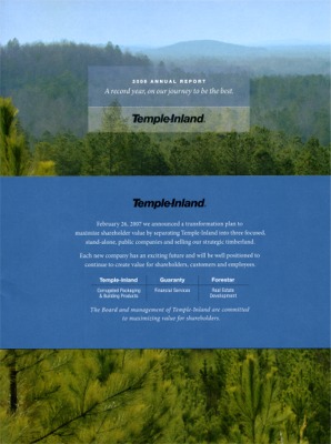 Download This Year's Entry Form Annual Report Highlights: View Competition Class Performance | Company Name: | Temple-Inland    | | Company Web Site: | www.templeinland.com | | Company Ticker Symbol: | TIN | | Annual Revenue: | $1+ Billion | | Employee Base: | 10,000+ Employees | | Core Industry: | Materials | Approximate Number of Pages: (Narrative/Financial Percent) | 142 (11.3%/88.7%) | | Notable Feature(s): | Outer Band | | Award Garnered: | Bronze | | | | Judging Results | | First Impression: | | | Report Cover: | | | Letter to Shareholders: | | | Report Narrative: | | | Report Financials: | | | Creativity: | | | Message Clarity: | | | Information Accessibility: | | | Total Score: | |