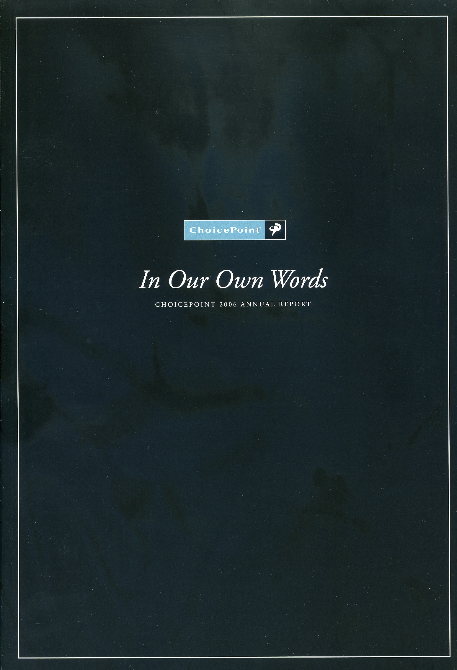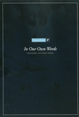 Download This Year's Entry Form Annual Report Highlights: View Competition Class Performance | Company Name: | ChoicePoint    | | Company Web Site: | www.choicepoint.com | | Company Ticker Symbol: | CPS | | Annual Revenue: | $1+ Billion | | Employee Base: | 1,000 - 10,000 Employees | | Core Industry: | Technology - Software | Approximate Number of Pages: (Narrative/Financial Percent) | 66 (30.3%/69.7%) | | Notable Feature(s): | Fold-Out Cover | | Award Garnered: | Honors | | | | Judging Results | | First Impression: | | | Report Cover: | | | Letter to Shareholders: | | | Report Narrative: | | | Report Financials: | | | Creativity: | | | Message Clarity: | | | Information Accessibility: | | | Total Score: | |