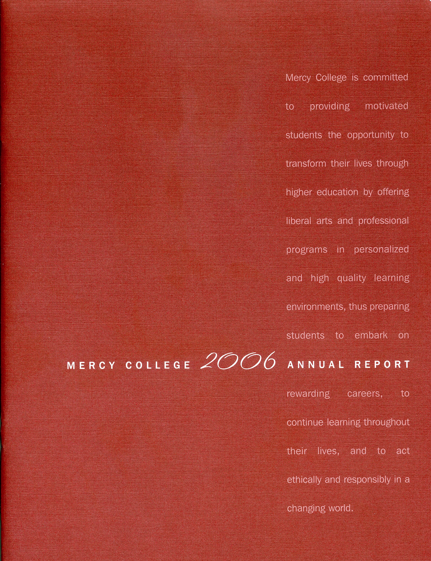 Download This Year's Entry Form Annual Report Highlights: View Competition Class Performance | Company Name: | Mercy College    | | Company Web Site: | www.mercy.edu | | Annual Revenue: | $10 Million - $100 Million | | Employee Base: | 100 - 1,000 Employees | | Core Industry: | Educational | Approximate Number of Pages: (Narrative/Financial Percent) | 32 (62.5%/37.5%) | | Award Garnered: | Bronze | | | | Judging Results | | First Impression: | | | Report Cover: | | | Letter to Shareholders: | | | Report Narrative: | | | Report Financials: | | | Creativity: | | | Message Clarity: | | | Information Accessibility: | | | Total Score: | |