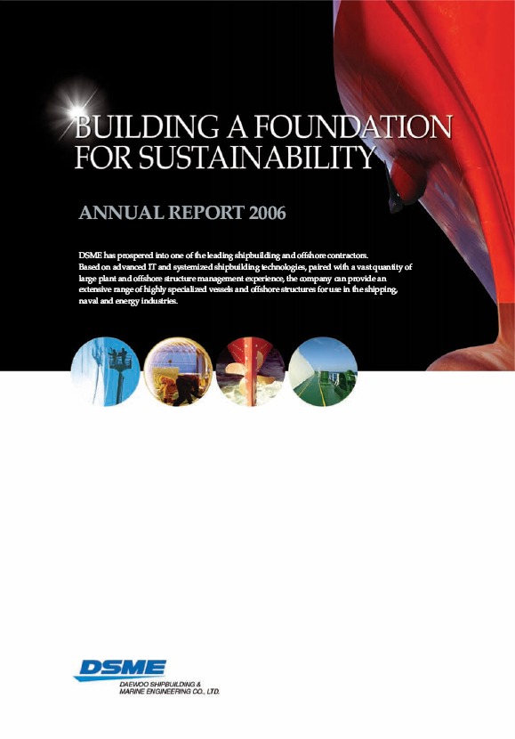 Download This Year's Entry Form Annual Report Highlights: View Competition Class Performance | Company/Agency Name: | Daewoo Shipbuilding & Marine Engineering Co., Ltd.    / IR BizNet, Inc. | | Company/Agency Web Site: | www.dsme.co.kr / www.irbiznet.com | | Annual Revenue: | $1+ Billion | | Employee Base: | 10,000+ Employees | | Core Industry: | Equipment, Machinery & Instruments | Approximate Number of Pages: (Narrative/Financial Percent) | 76 (36.8%/63.2%) | | Notable Feature(s): | Unique Cover Material | | Award Garnered: | Honors | | | | Judging Results | | First Impression: | | | Report Cover: | | | Letter to Shareholders: | | | Report Narrative: | | | Report Financials: | | | Creativity: | | | Message Clarity: | | | Information Accessibility: | | | Total Score: | |